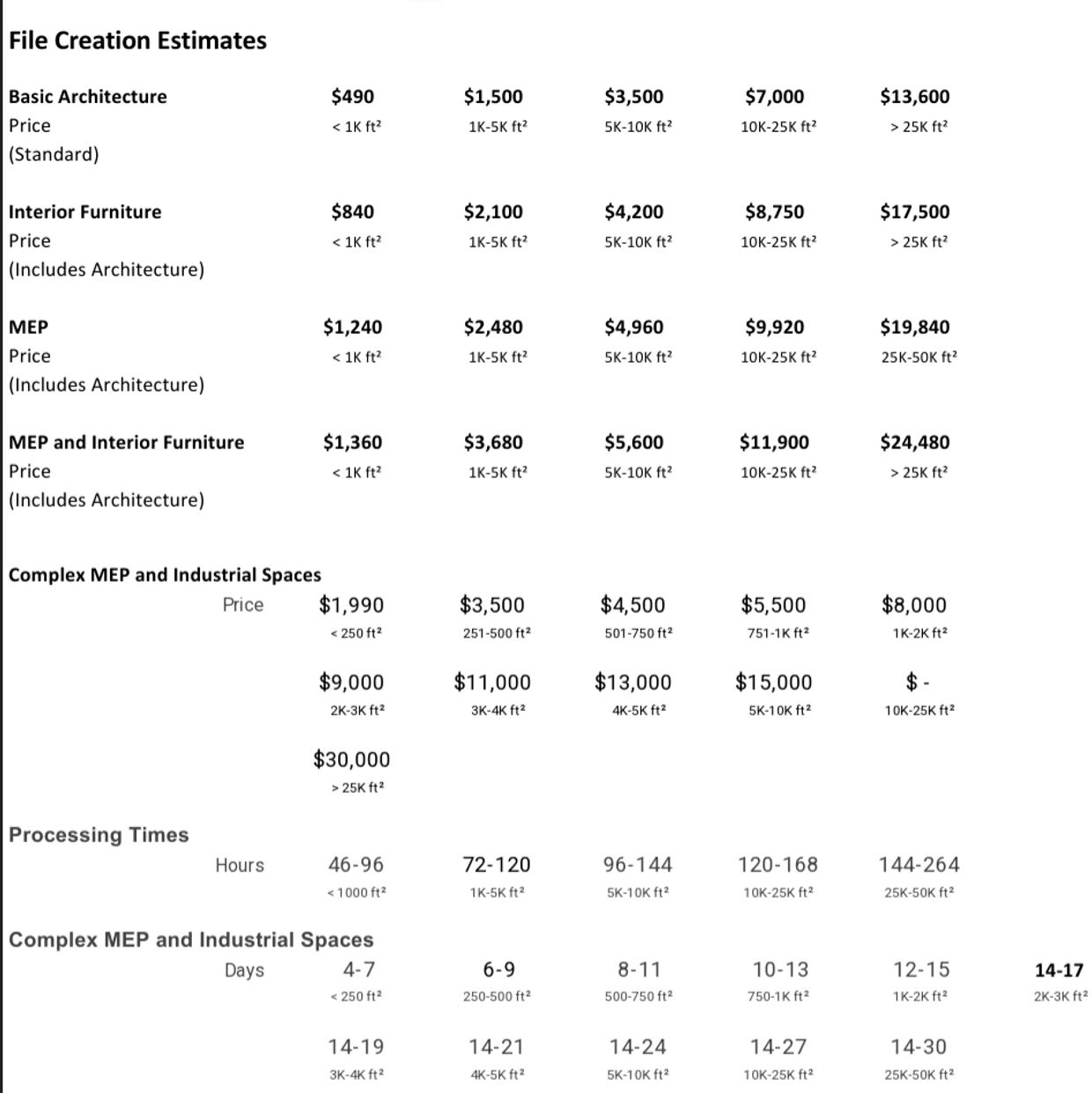 Our standard offering is only available for spaces up to 100K ft². Please contact support for spaces larger than 100K ft². Price estimate may change once final square footage is calculated during BIM File creation.